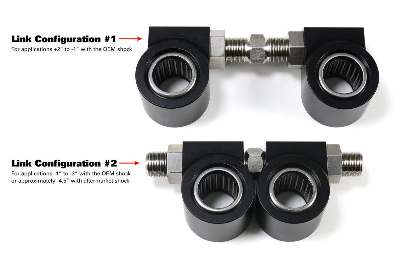 - Window Link is ‘convertible’ to provide adjustment range potential from +2” to approximately -4.5” (modification and/or aftermarket shortened shock required)