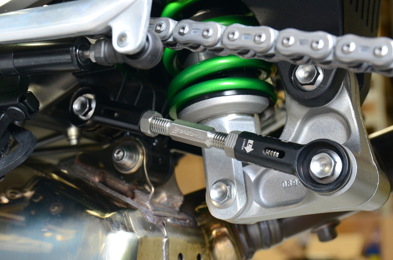 Designed for riders who demand performance and safety, the Brock’s Performance Adjustable Window Link Kit is the ultimate solution for confidently dialing your Ninja’s suspension setup. Use stock links (and/or calipers) as a guide with equal threads showing in each window, and then count the same number of flats on the adjustment rods on each link to adjust ride height. Use the window as a final inspection before hitting the track. (Pro Tip: Always verify proper chain tension after making changes.)